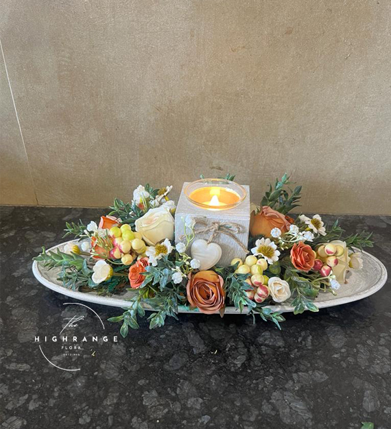 Illuminate your space with the Enchanting Glow Candle Stand. This captivating arrangement blends the warmth of flickering candles with the beauty of silk flowers. Delicate blooms in hues of yellow and blush, paired with faux greenery, gracefully encircle the candle, creating a mesmerizing centerpiece.
